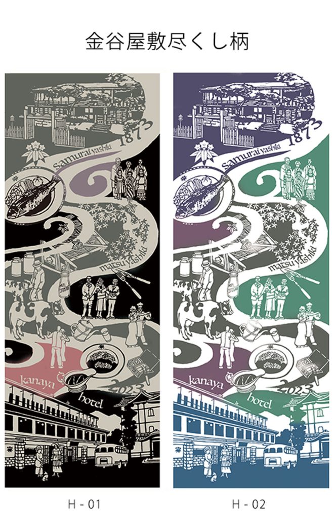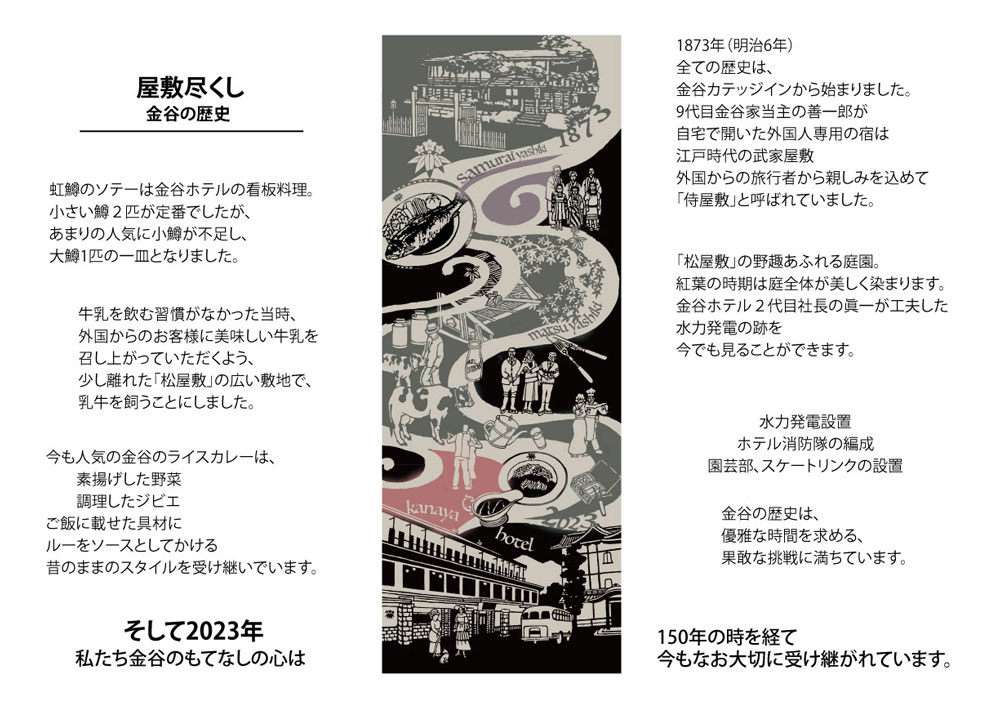 1873(明治6)年金谷善一郎は四軒町の自宅を改造して、民宿『金谷カテッジイン(侍屋敷)』を創業。20年後に金谷ホテルを創業した際、近隣の松屋敷の敷地で牛を飼い、外国人客に牛乳を提供しました。150年を経た2023(令和5)年6月、創業記念のお祝いに屋敷尽くし手拭いをお届けします